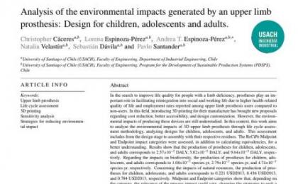 Equipo de investigación integrado por estudiantes de postgrado y académicos de nuestro Departamento, publicó recientemente el artículo “Analysis of the environmental impacts generated by an upper limb prosthesis: Design for children, adolescents and adults” en la revista Sustainable Production and Consumption. La investigación evaluó los impactos ambientales asociados a la fabricación de prótesis de extremidades impresas en 3D, considerando diseños para niños, adolescentes y adultos.