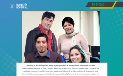 En calidad de investigadores principales, la Dra. Andrea Espinoza y El Dr. Óscar C. Vásquez, académicos del Departamento de Ingeniería Industrial de la Universidad de Santiago de Chile forman parte de un nuevo proyecto transdisciplinario ATE250058 titulado «Food territories and government procurement: sustainability and socio-spatial justice». El cual analizará los impactos ambientales, territoriales, sociales y nutricionales de diversas políticas públicas de alimentación vigentes en el país. La iniciativa es liderada por la Universidad Técnica Federico Santa María y cuenta con la participación de la Pontificia Universidad Católica además de nuestra institución.